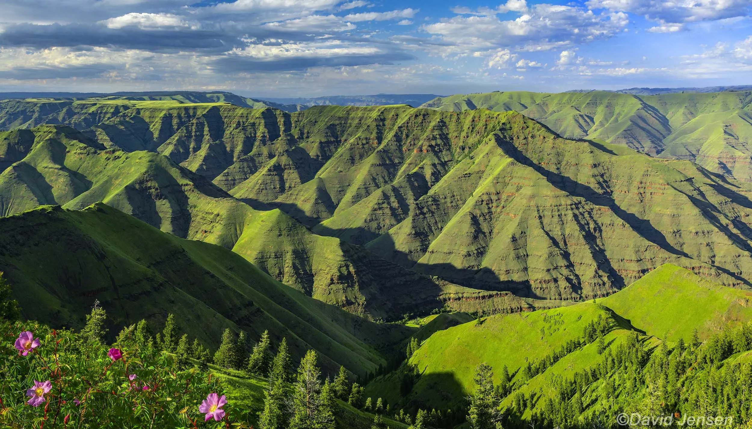 Much of Oregon’s northeast corner is a dissected plateau—so dissected by mountains and canyons that it is often not recognizable as a plateau at all. But the 330,000 acres of Zumwalt Prairie are less dissected and relatively flat, justifying its description as a prairie. Here can be found flowered grasslands stretching expansively to the northern and western horizons and to the snowy mountain ranges on the south and east.